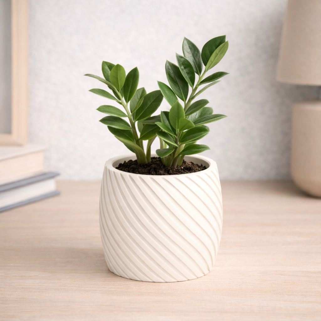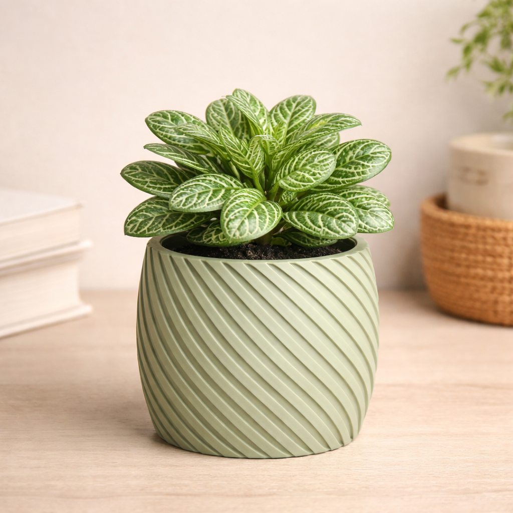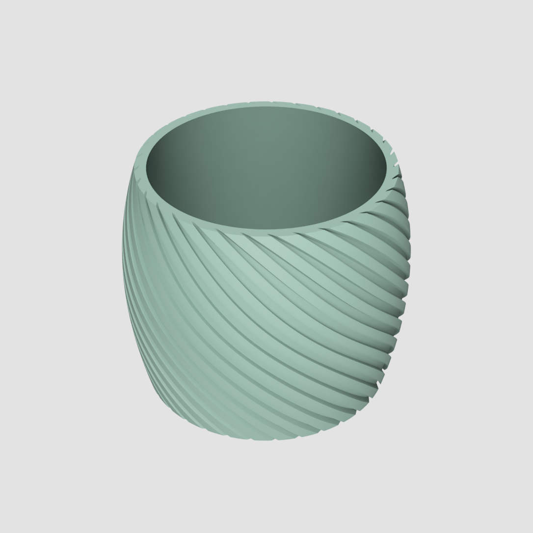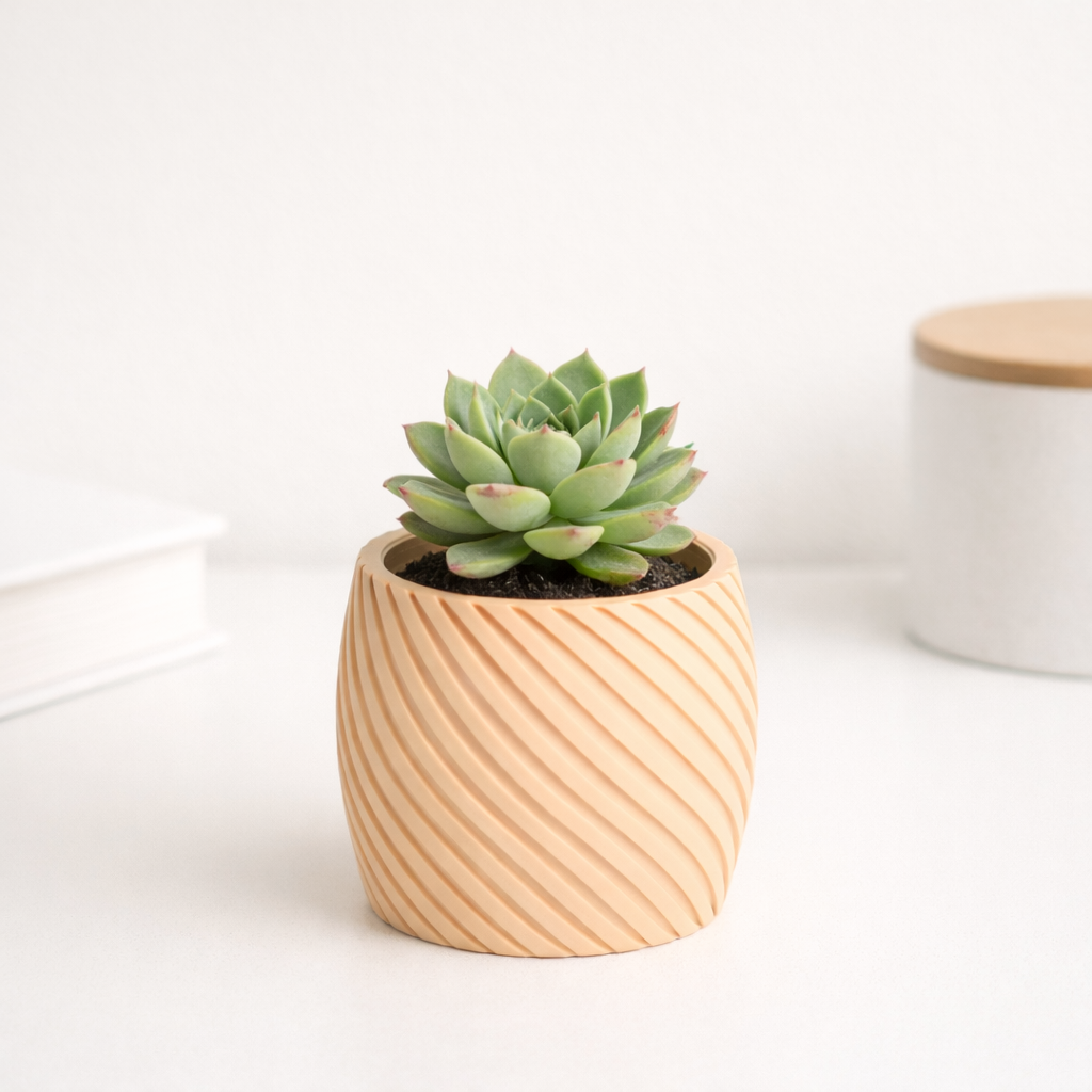 The Altona – Ribbed Spiral Pot is a contemporary 3D printed planter designed to bring subtle architectural detail into your space. Its flowing spiral ribs wrap seamlessly around the form, creating depth, shadow and movement while maintaining a clean, minimalist silhouette.